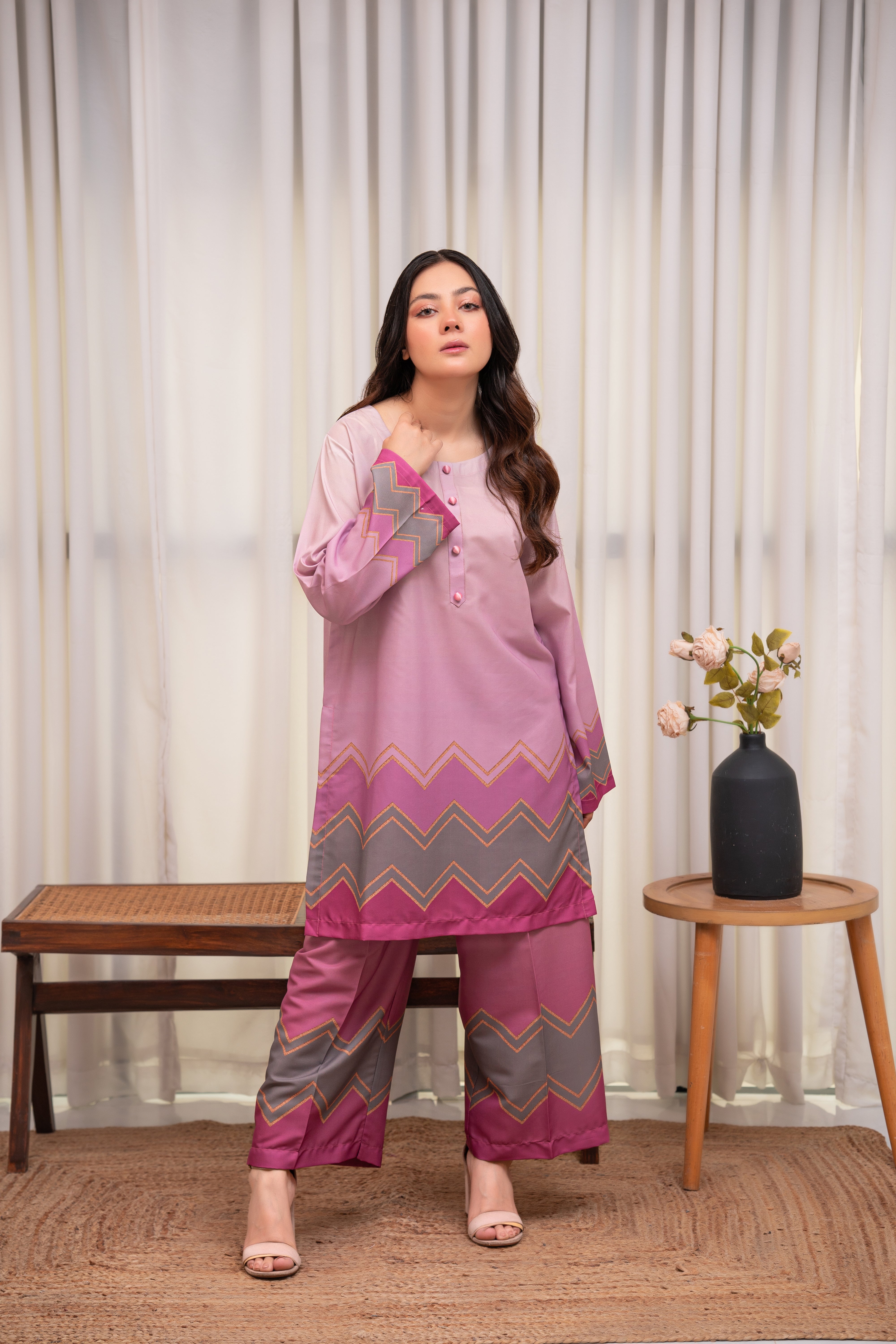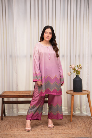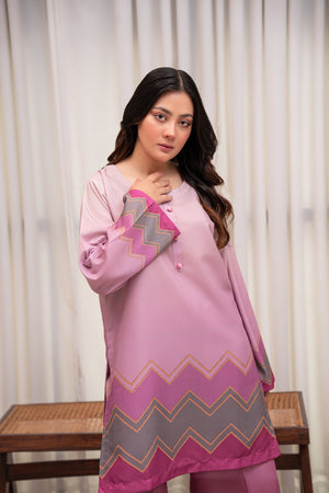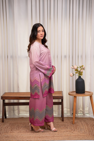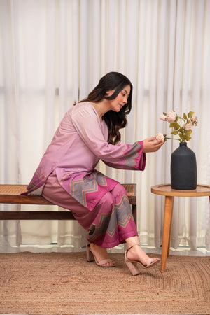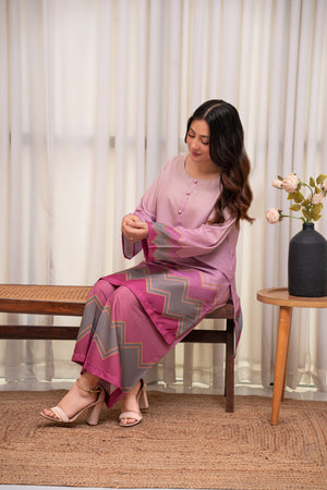 A dreamy lilac-pink crepe two-piece featuring soft pastel hues and chevron detailing for a modern touch. Lightweight, breathable, and effortlessly chic for an elegant everyday look.