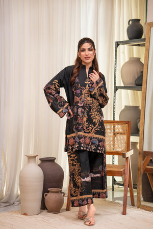 A luxurious black crepe two-piece adorned with intricate gold and floral patterns, evoking timeless charm. Effortlessly chic and breathable, perfect for a sophisticated statement look.